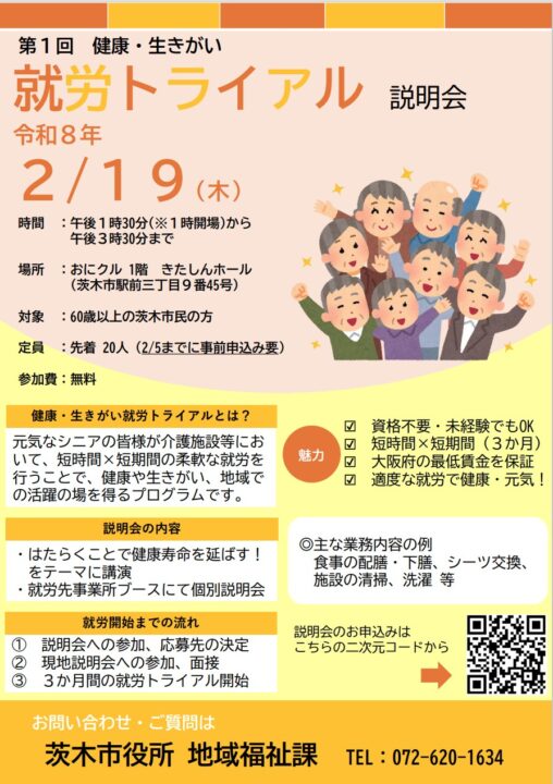 元気なシニアの皆様が、介護施設などにおいて短期間・短時間の柔軟な就労を行うことで、健康の維持や生きがいづくりにつなげていただくことを目的とした取り組みです。無理のない範囲で社会と関わりながら、ご自身の経験や力を活かしていただける機会となっております。ぜひ多くの方にご参加いただき、無理のない働き方を通じて、健康づくりや生きがいにつなげていただければ幸いです。皆さまのご参加を心よりお待ちしております。